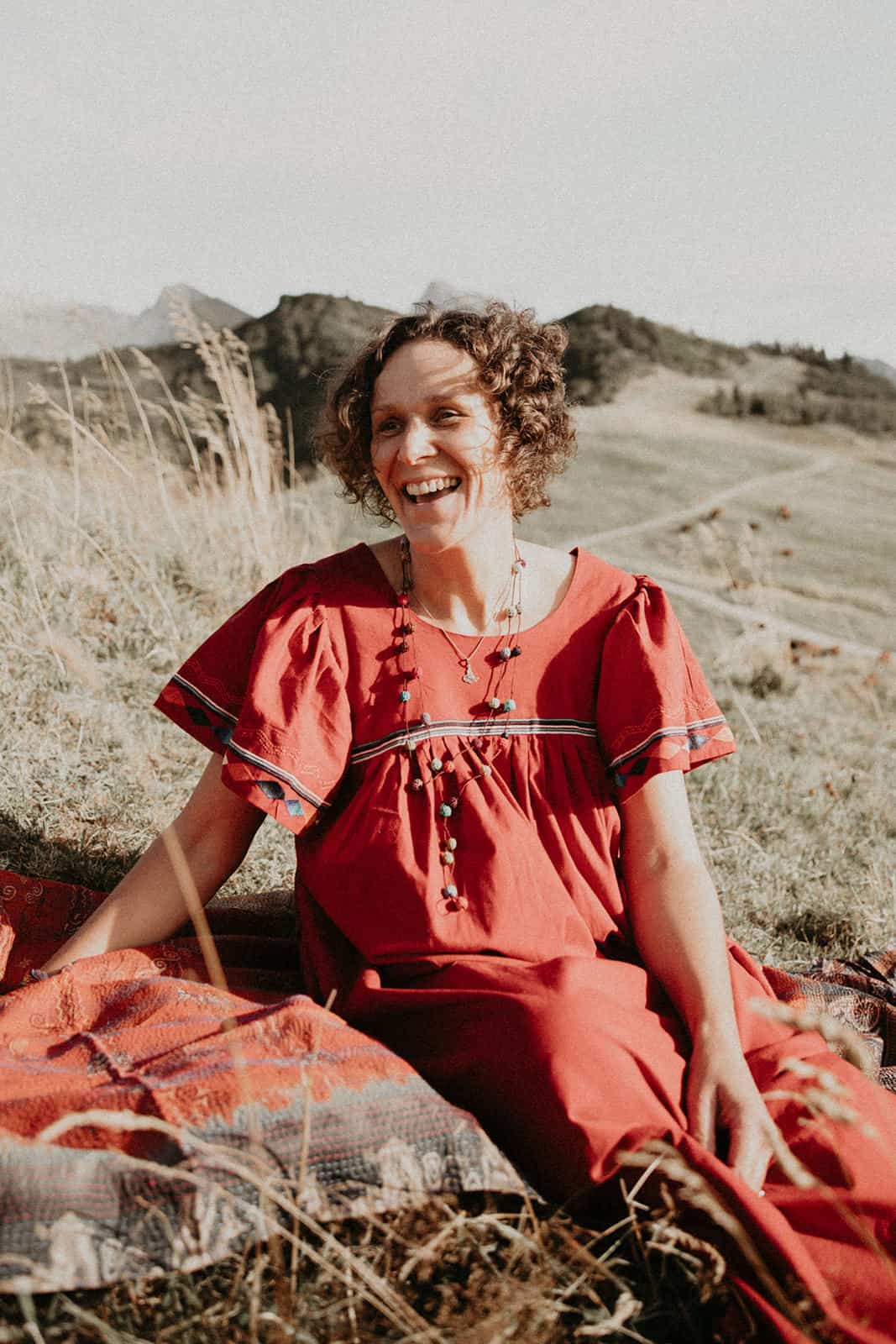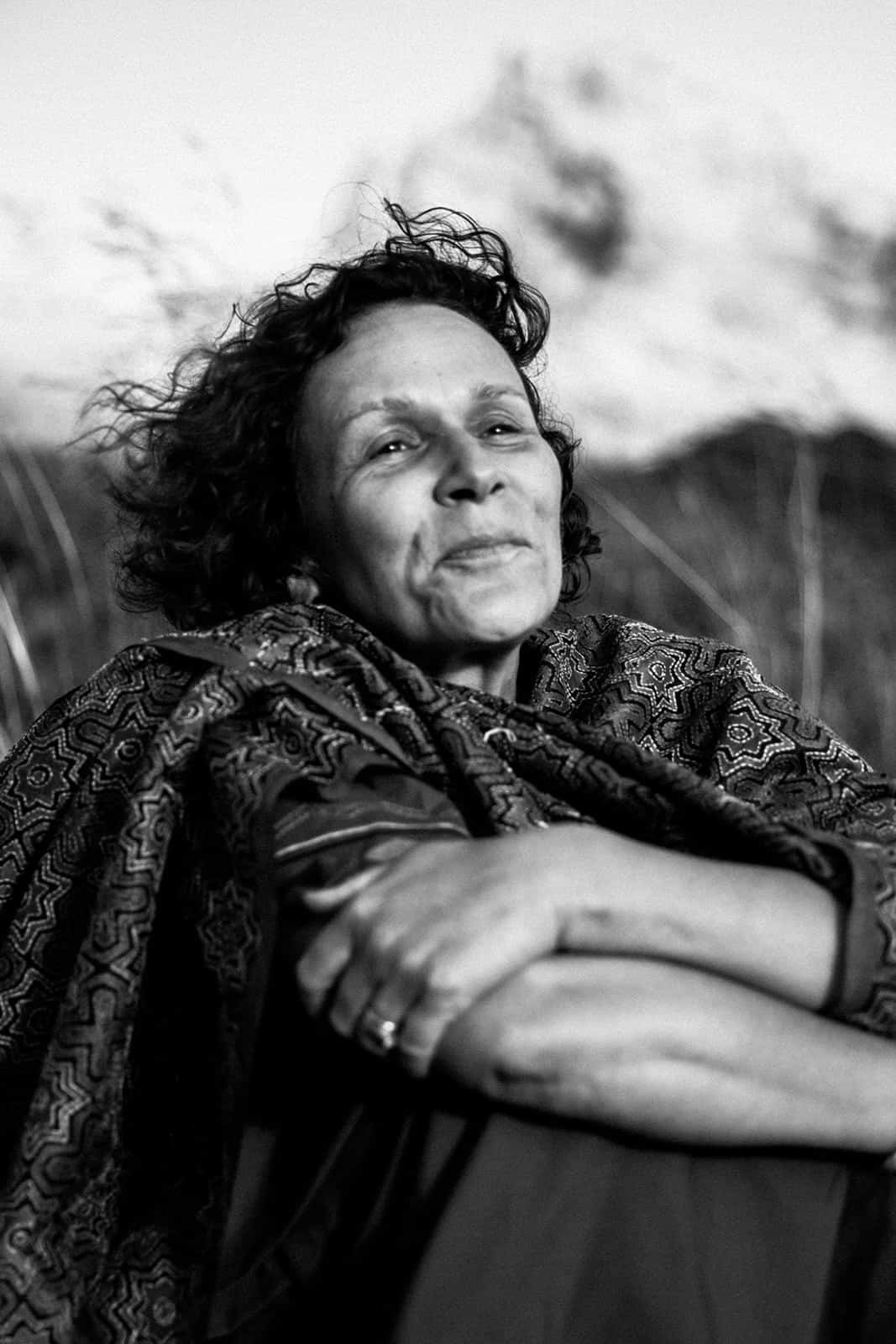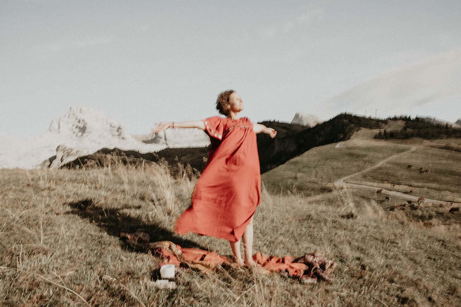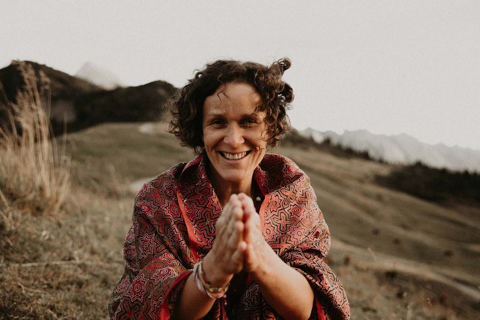 Et tu sais quoi? Je le savais que tu étais faite pour la photothérapie, que tu étais, es, plus que douée. Ton regard, ta perception de l’être que tu captures pour mieux le libérer est si doux, tendre, enveloppant, réconfortant, profond, incroyable, authentique et simple. Tout toi quoi! Et ce paysage… mon chez moi. Je suis dans mon élément, mes montagnes, ma nature, ma lumière et mon vent. Je perçois presque les odeurs que nous sentions à ce moment-là, pas que le stick de sauge ni la bougie, mais aussi les herbes folles de cette fin d’été, les vaches et leurs bouses âcres, l’odeur de ma peau qui frissonne, du vent, du soleil couchant, le parfum minéral des sommets juste derrière. Tu as su capter ce paysage en toile de fond avec tellement de sensibilité, personnage à part entière, discret et puissant à la fois. Et la lumière, ces paillettes de lumière… une pluie de diamants un soir d’été dans des teintes un peu brûlées, un peu passées qui annoncent l’automne à venir. Le vent dans l’étole, j’adore! D’ailleurs j’aime tout, de ton regard, de mon regard, de tes questions, de mes réponses, de l’histoire de cette vie déroulée dans les mots partagés comme dans le corps, le regard, les rides et comme du moment passé ensemble, précieux, secret et universel. Merci infiniment ma merveilleuse Olivia. Je ne te remercierai jamais assez pour ce mère-veilleux moment et ces si belles images où tu es si présente.
