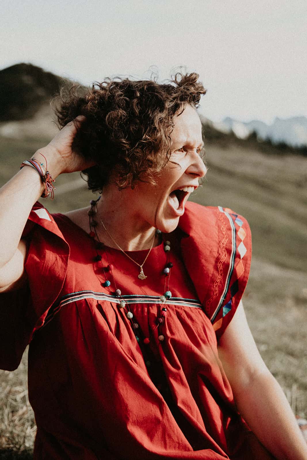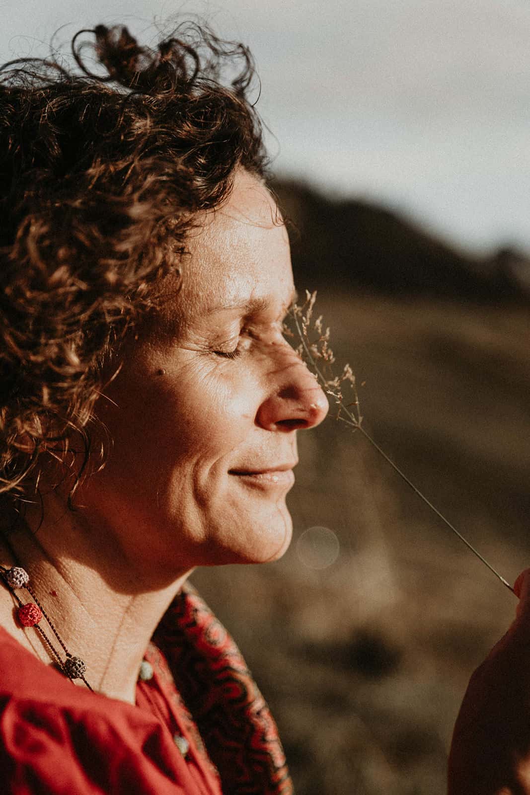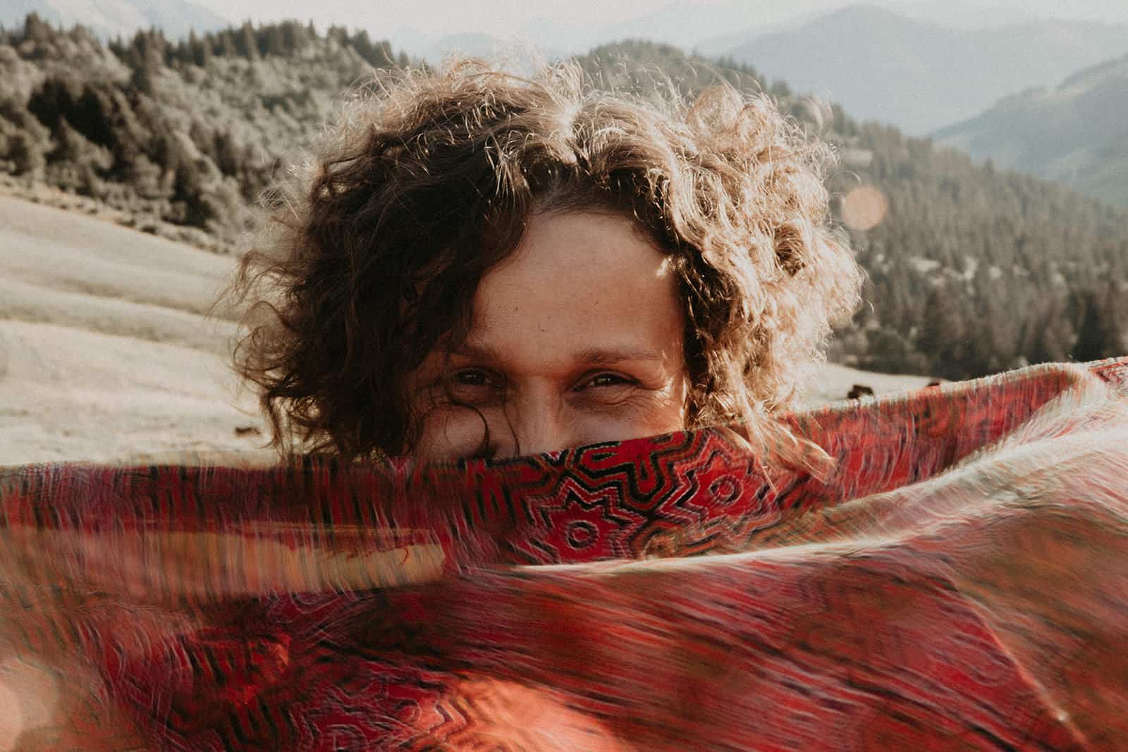 Et tu sais quoi? Je le savais que tu étais faite pour la photothérapie, que tu étais, es, plus que douée. Ton regard, ta perception de l’être que tu captures pour mieux le libérer est si doux, tendre, enveloppant, réconfortant, profond, incroyable, authentique et simple. Tout toi quoi! Et ce paysage… mon chez moi. Je suis dans mon élément, mes montagnes, ma nature, ma lumière et mon vent. Je perçois presque les odeurs que nous sentions à ce moment-là, pas que le stick de sauge ni la bougie, mais aussi les herbes folles de cette fin d’été, les vaches et leurs bouses âcres, l’odeur de ma peau qui frissonne, du vent, du soleil couchant, le parfum minéral des sommets juste derrière. Tu as su capter ce paysage en toile de fond avec tellement de sensibilité, personnage à part entière, discret et puissant à la fois. Et la lumière, ces paillettes de lumière… une pluie de diamants un soir d’été dans des teintes un peu brûlées, un peu passées qui annoncent l’automne à venir. Le vent dans l’étole, j’adore! D’ailleurs j’aime tout, de ton regard, de mon regard, de tes questions, de mes réponses, de l’histoire de cette vie déroulée dans les mots partagés comme dans le corps, le regard, les rides et comme du moment passé ensemble, précieux, secret et universel. Merci infiniment ma merveilleuse Olivia. Je ne te remercierai jamais assez pour ce mère-veilleux moment et ces si belles images où tu es si présente.