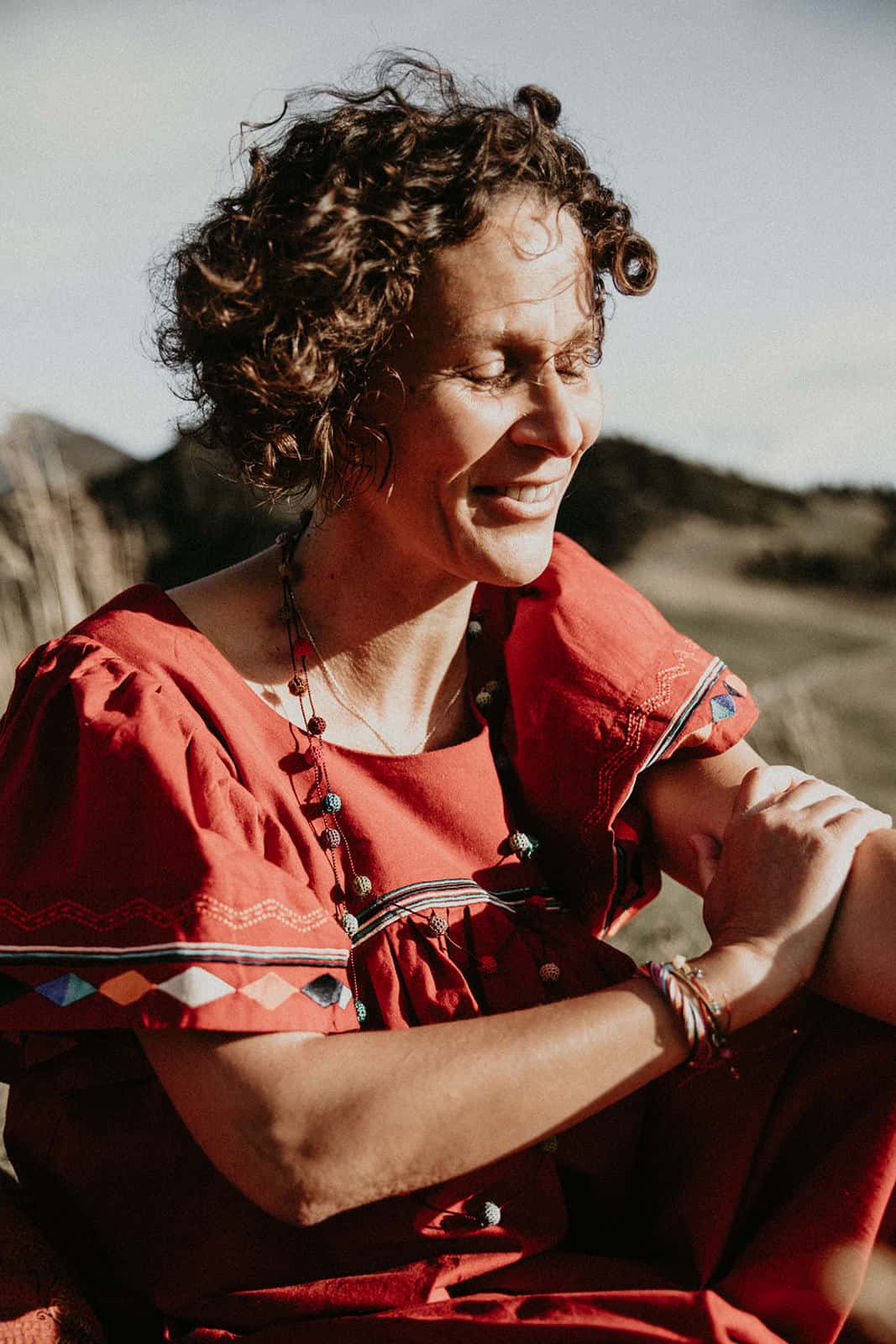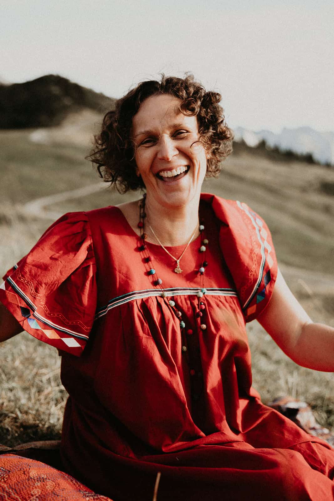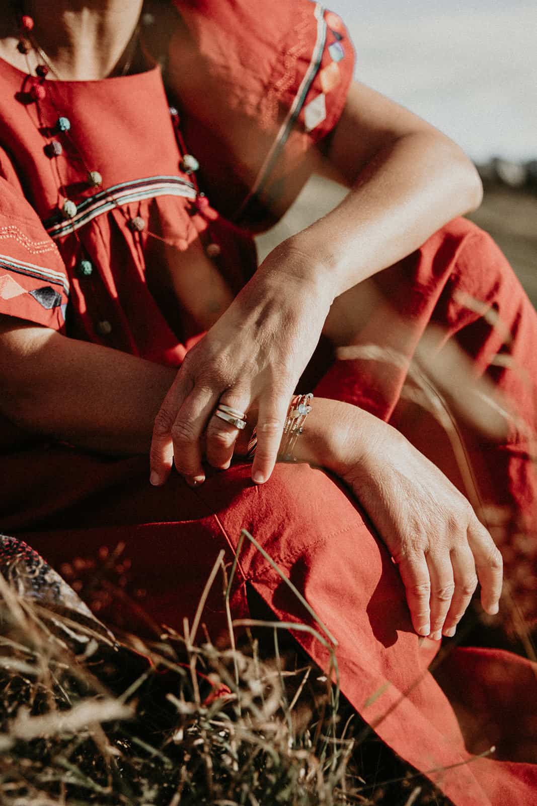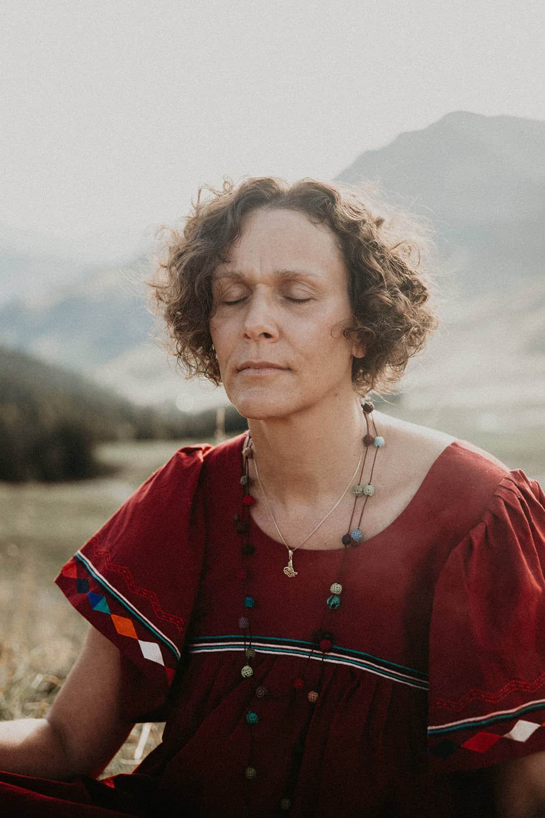 Et tu sais quoi? Je le savais que tu étais faite pour la photothérapie, que tu étais, es, plus que douée. Ton regard, ta perception de l’être que tu captures pour mieux le libérer est si doux, tendre, enveloppant, réconfortant, profond, incroyable, authentique et simple. Tout toi quoi! Et ce paysage… mon chez moi. Je suis dans mon élément, mes montagnes, ma nature, ma lumière et mon vent. Je perçois presque les odeurs que nous sentions à ce moment-là, pas que le stick de sauge ni la bougie, mais aussi les herbes folles de cette fin d’été, les vaches et leurs bouses âcres, l’odeur de ma peau qui frissonne, du vent, du soleil couchant, le parfum minéral des sommets juste derrière. Tu as su capter ce paysage en toile de fond avec tellement de sensibilité, personnage à part entière, discret et puissant à la fois. Et la lumière, ces paillettes de lumière… une pluie de diamants un soir d’été dans des teintes un peu brûlées, un peu passées qui annoncent l’automne à venir. Le vent dans l’étole, j’adore! D’ailleurs j’aime tout, de ton regard, de mon regard, de tes questions, de mes réponses, de l’histoire de cette vie déroulée dans les mots partagés comme dans le corps, le regard, les rides et comme du moment passé ensemble, précieux, secret et universel. Merci infiniment ma merveilleuse Olivia. Je ne te remercierai jamais assez pour ce mère-veilleux moment et ces si belles images où tu es si présente.